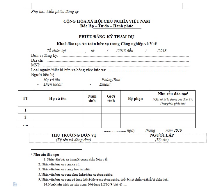 THÔNG BÁO KHAI GIẢNG KHÓA ĐÀO TẠO 13/10/2018-14/10/2018 Khoá đào tạo An toàn bức xạ đối với nhân viên bức xạ, người phụ trách an toàn bức xạ (Theo Thông tư 34/2014/TT-BKHCN ngày 27 tháng 11 năm 2014) Kính gửi : Ban lãnh đạo các cơ quan/tổ chức sử dụng thiết bị bức xạ, nguồn …