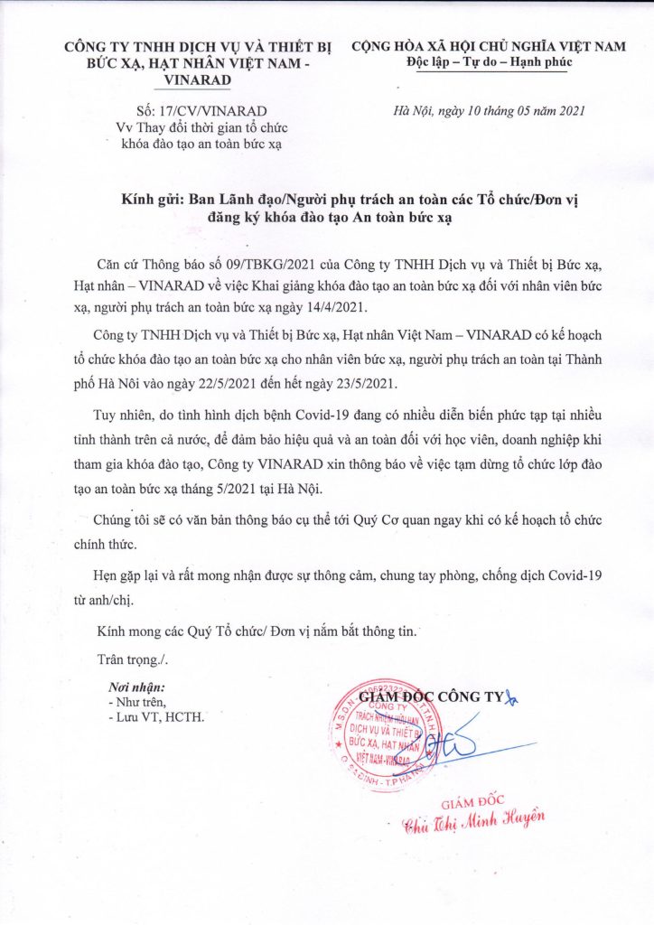 Kính gửi: – Ban lãnh đạo – Người phụ trách an toàn các Tổ chức – Đơn vị đăng ký khóa đào tạo An toàn bức xạ Căn cứ Thông báo số 09/TBKG/2021 của Công ty TNHH Dịch vụ …